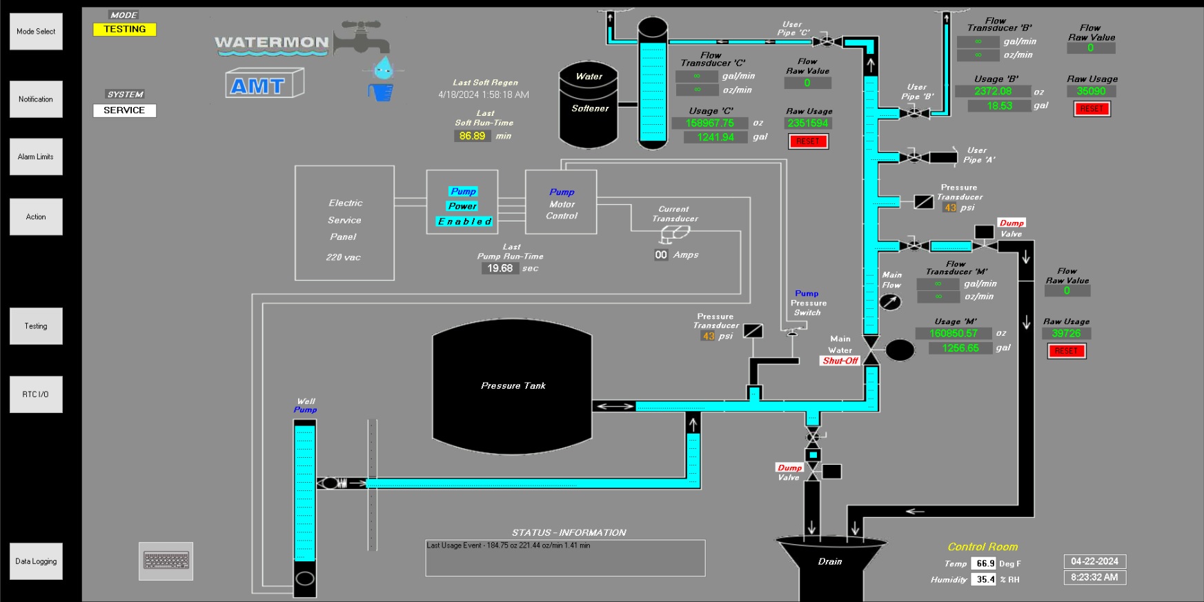Designed to Accommodate: Private Well Pump / Pressure Tank Water Systems Features: - System Does NOT require access to 'Cloud' server or Subscription service (Insurance Co. May require 3rd party monitoring for discount) - Uses Pulse Output type Flow Sensors - Can detect water Usage as low as 0.05 oz/sec at all times (NO Special Leak Test time or cycle) - Retains Total Flow Usage Data - Non Volatile Memory - Logs all Events (Usage, Pump Run Time, Softener Regen..etc) - Provision to Analyze all Logged Data and provide summary Report - Able to Dump ALL System Water Pressure on Shut-Off condition - Emergency System Shut-Off (Pushbutton) - Alarm Relay Contact for Horn / Siren Continuous Monitoring of : - FLOW (oz/min and gal/min)        - PRESSURE - Well Pump/Pressure Tank and Building Pressure - WELL PUMP MOTOR CURRENT (Amps) - WELL PUMP RUN TIME - WATER SOFTENER (Regen Cycle) - CONTACT LEAK SENSORS                       - TEMPERATURE & HUMIDITY     System: Graphical Touch Screen Interface Controls Automated Water System Valves (Shut-Off & Dump) Well Pump Motor Power Control 1PH 220VAC - Solid State System Battery Back-Up - (standard) Operates Automomously ...on failure of Utility Power and or Internet User Configurable Action Settings and Alarm Limits Built-In Water System Testing Communication: Provision to Remotely View and Control via Internet ...with PC or Cell Phone Integrates with Building Security System User Configurable Alarm Notifications... Texting and Email to Multiple Users